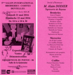 Ce week-end venait visiter le 4ème salon de Broderies, Dentelles aux fuseaux et Métiers d’Art à Mignaloux-Beauvoir, où je serai présente parmi les 40 exposants.